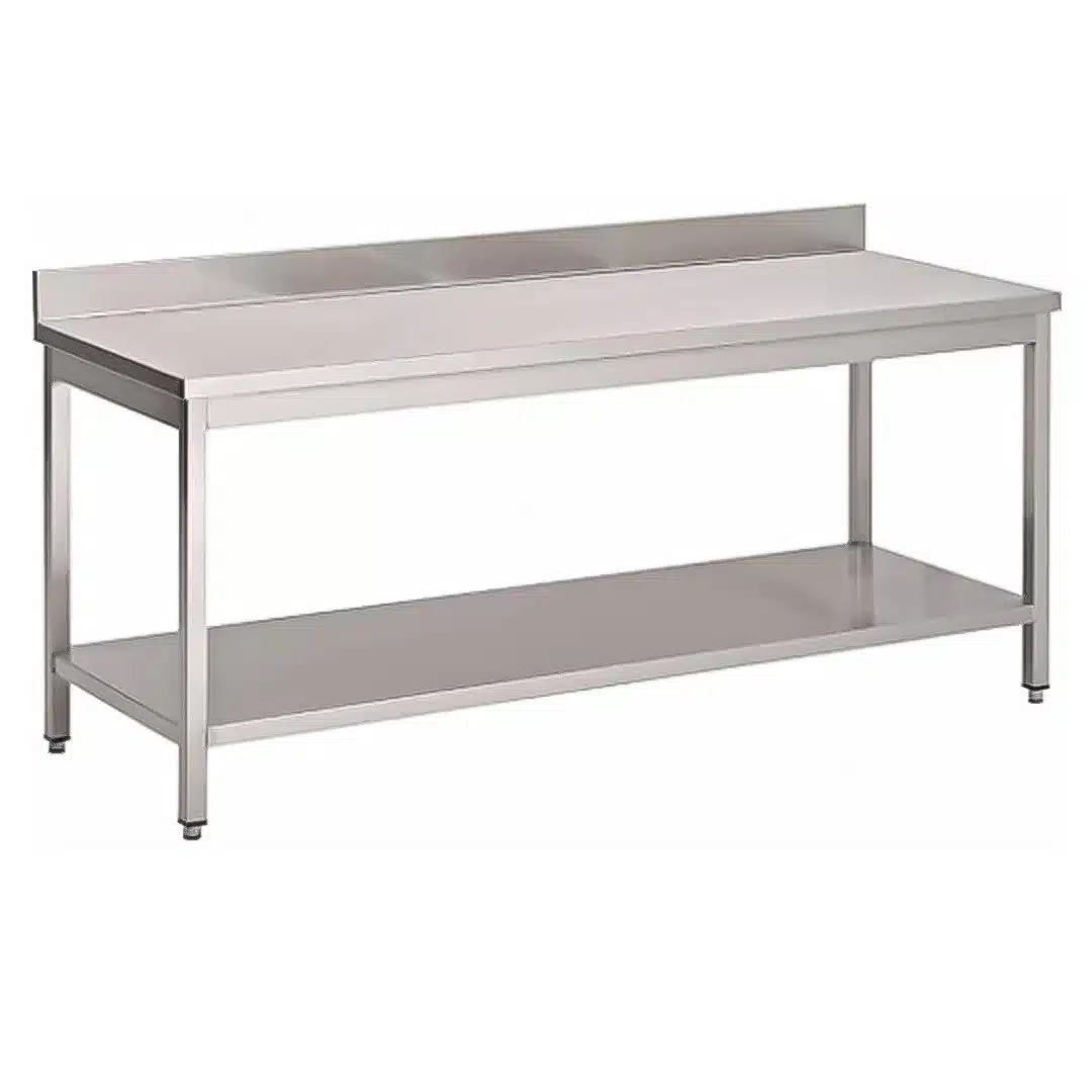 Table de travail Inox AISI 430 avec sous-tablette, adossée, fabrication sur mesure.