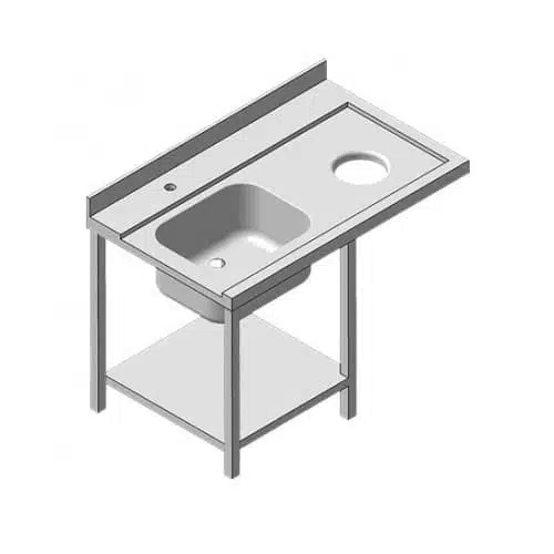 Table d’entrée avec 1 bac a gauche, 2 pieds, lave vaisselle à droite, longueur 1200 mm