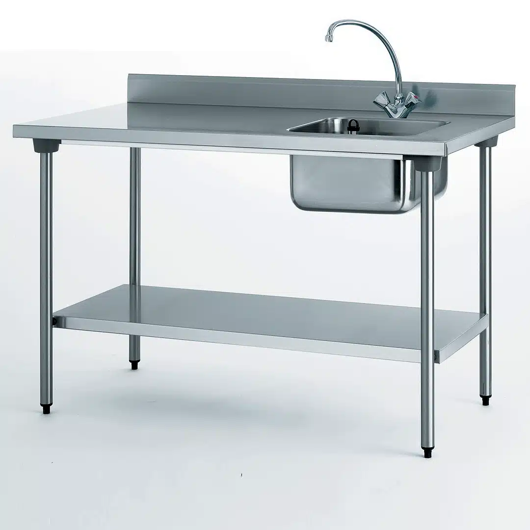 Table du chef avec robinet à dosseret et étagère, bac à droite