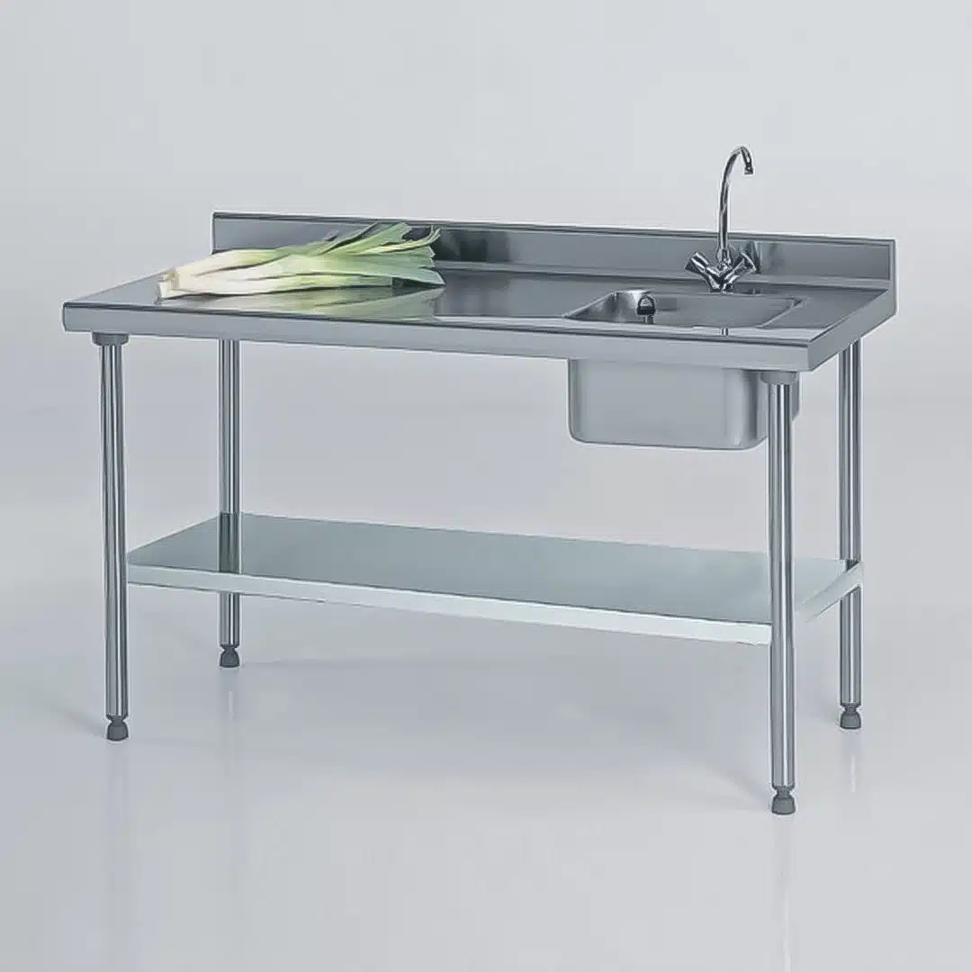 Table du chef sur-mesure, avec robinet, à dosseret + étagère, largeur 700 mm, avec bac, L 400 x P 400 x H 250 mm avec tube surverse et siphon, très utile dans le domaine de la restauration et l’hotellerie.