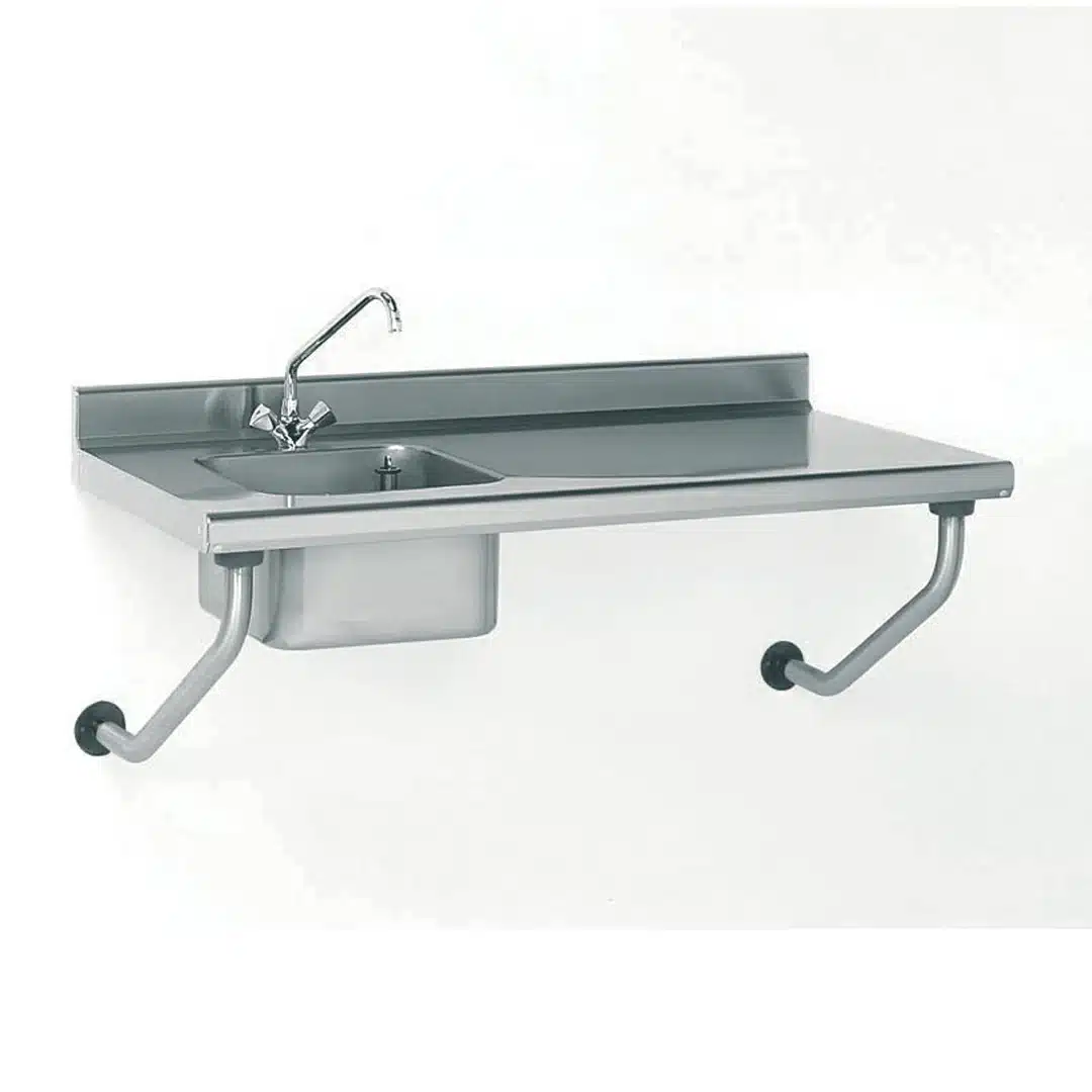 Table du chef suspendue TS 15N, avec robinet, bac à gauche, qui se fixe par 2 supports muraux sous le dosseret et 2 consoles Ø 45 mm avec vérins pour réglage de l’horizontalité.