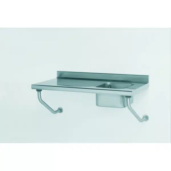 Table du chef suspendue TS 15N, sans robinet, bac à droite, qui se fixe par 2 supports muraux sous le dosseret et 2 consoles Ø 45 mm avec vérins pour réglage de l’horizontalité.