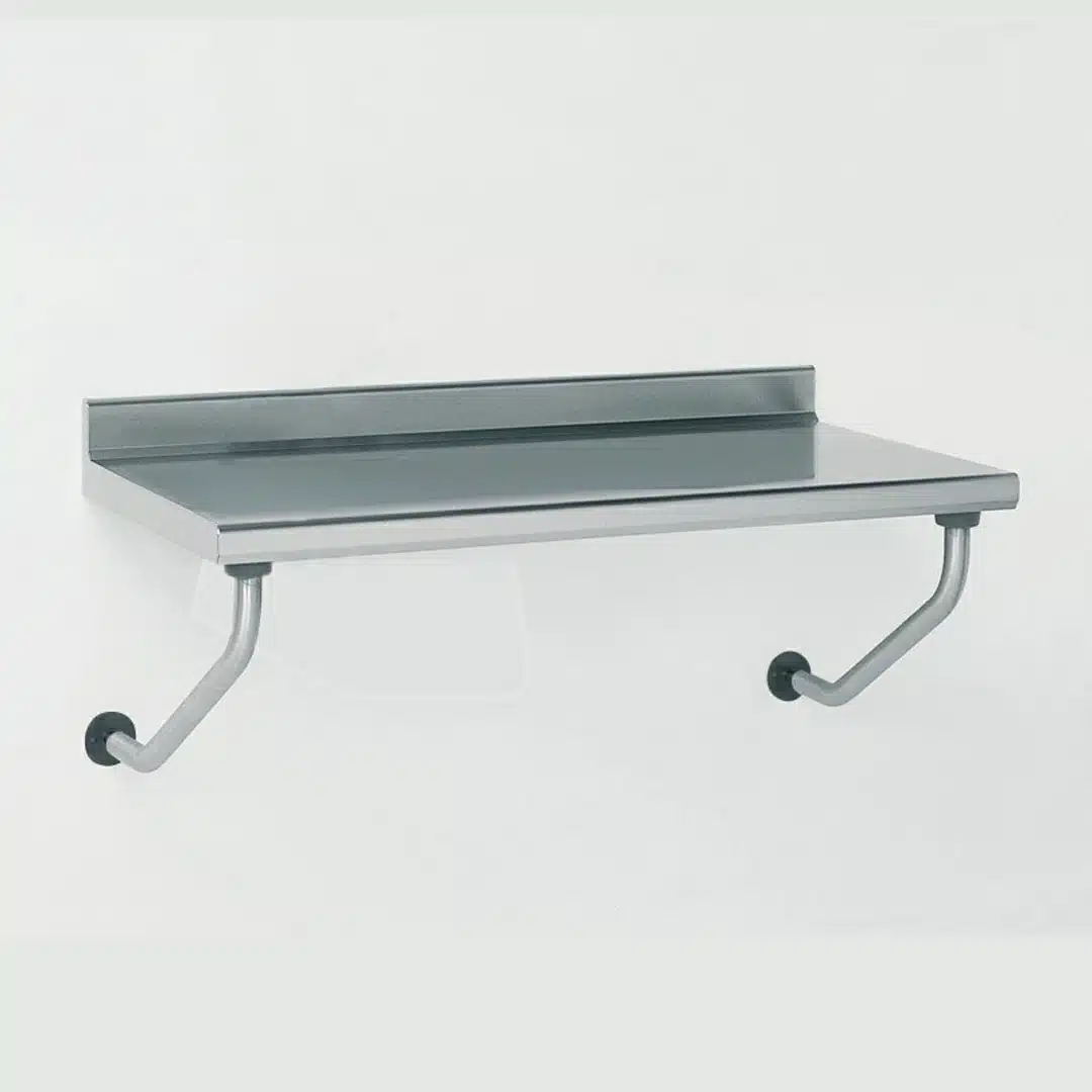 Table inox suspendue TS 15N, largeur 700 mm, qui se fixe par 2 supports muraux sous le dosseret et 2 consoles Ø 45 mm avec vérins pour réglage de l’horizontalité.