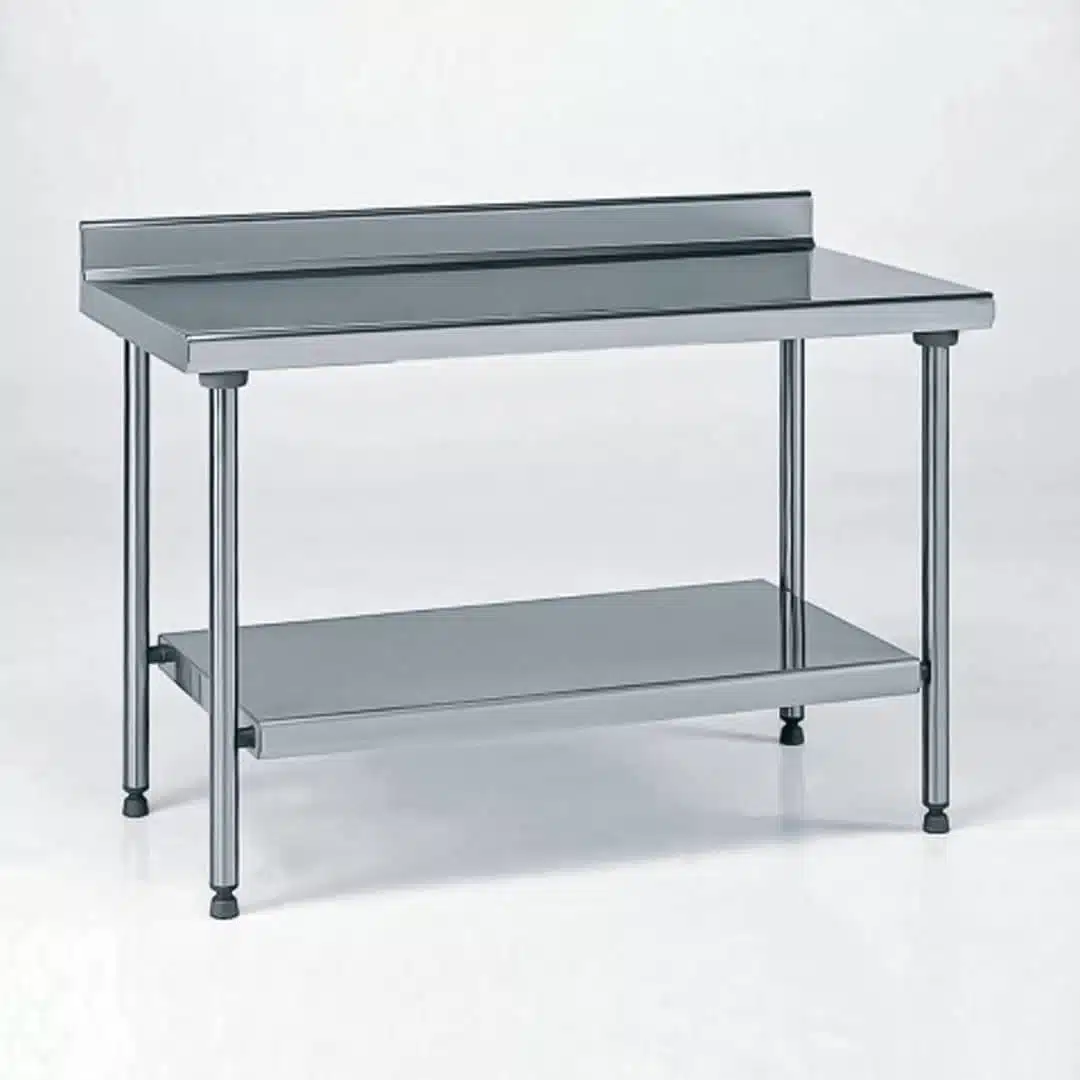 Table inox TS 15N, sur piètement, à dosseret + étagère, largeur 600 mm, parfaite pour une utilisation en milieu professionnel, avec une facilité de montage (par simple emboîtement autobloquant).