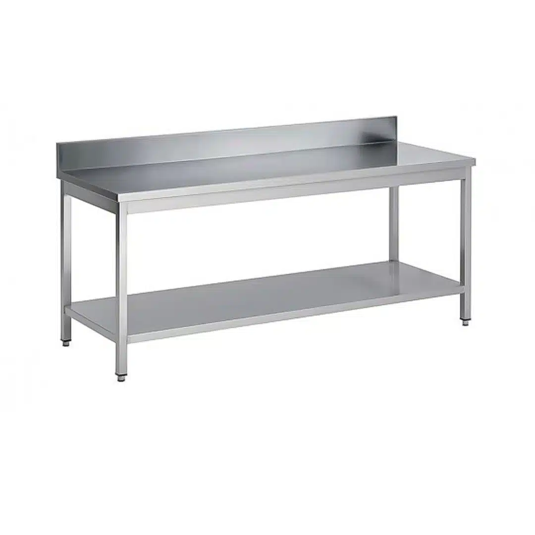 Table soudée bords droits, adossée avec étagère, en inox AISI 304, P 700 mm