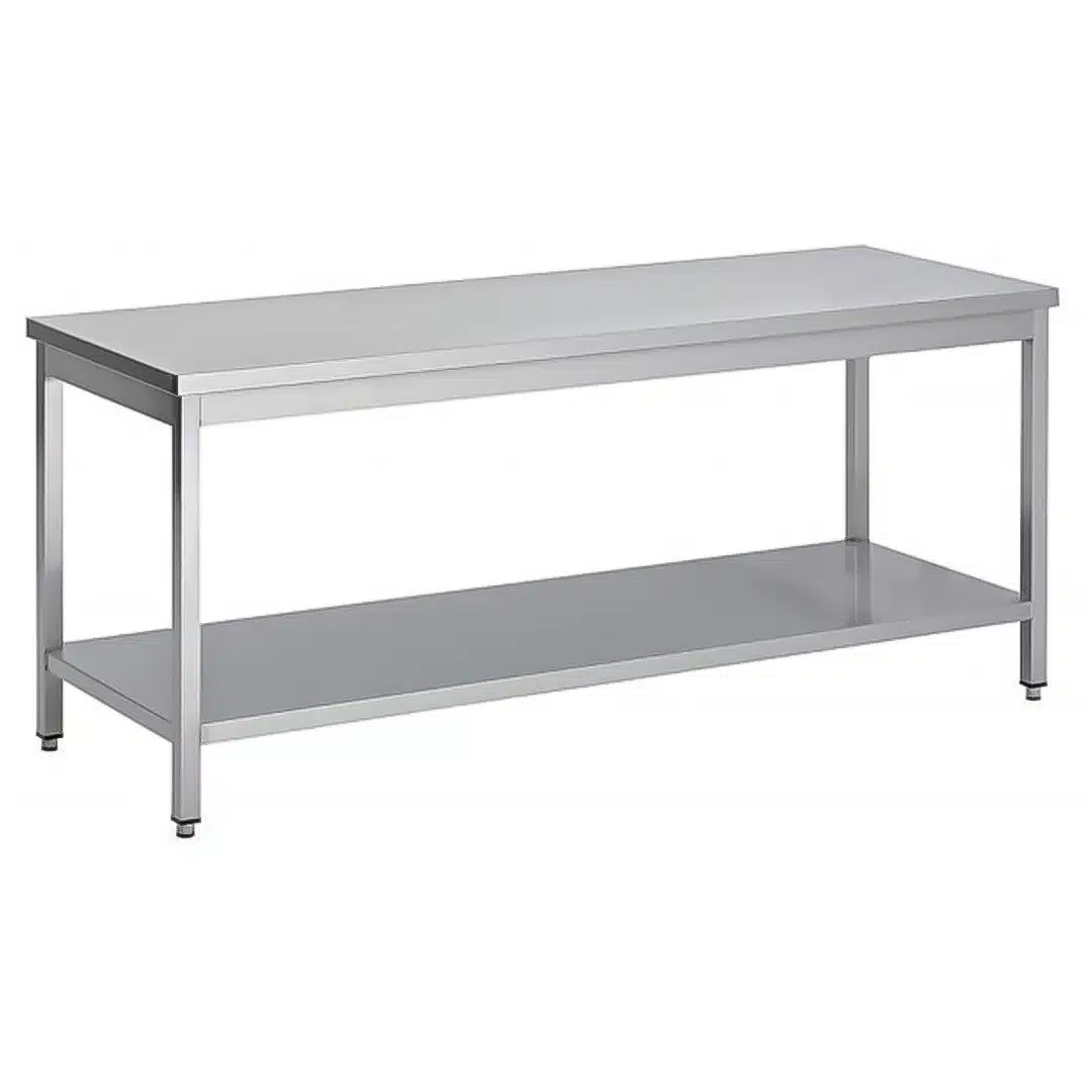 Table soudée bords droits, centrale + étagère, en inox AISI 304, P 800 mm