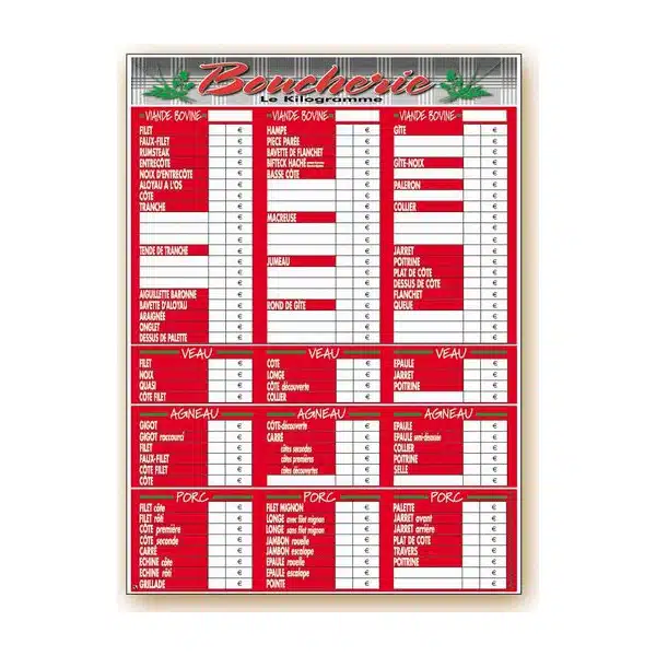 Tableau de prix pour viande bovine, veau, agneau, porc