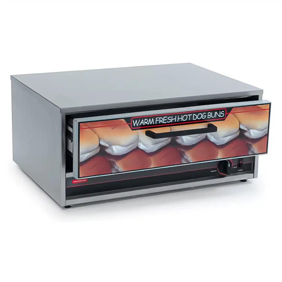 Tiroir chauffe pain hot-dog 32 pains pour grill saucisses rotatif.