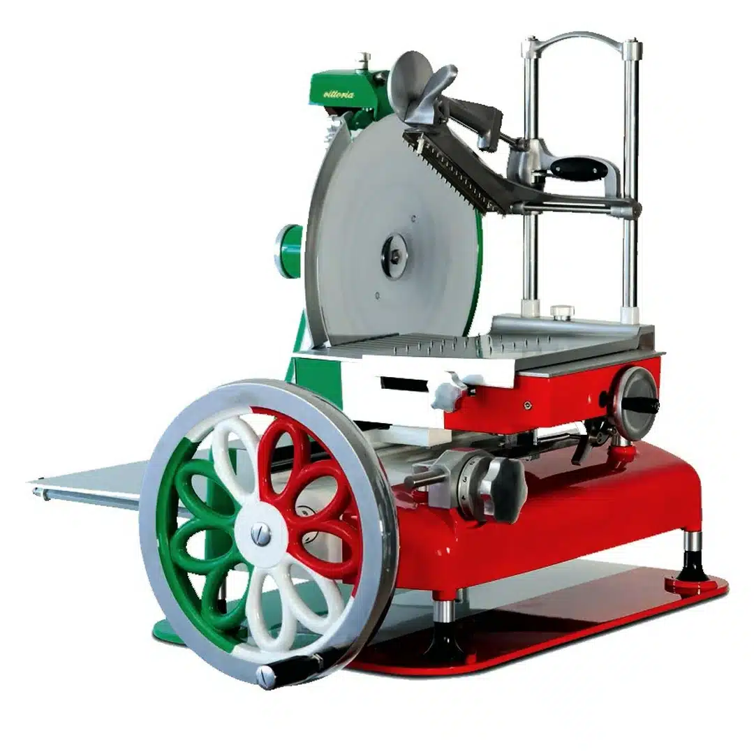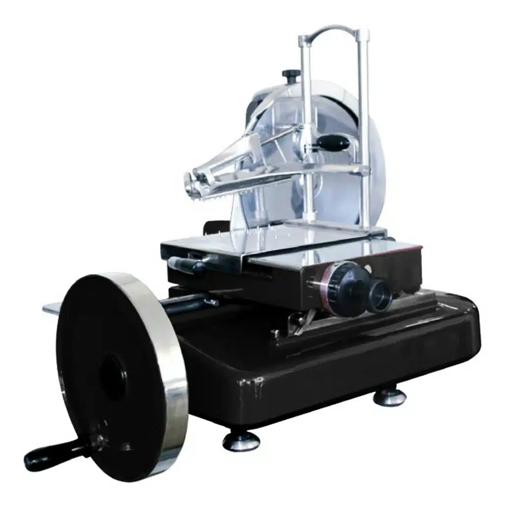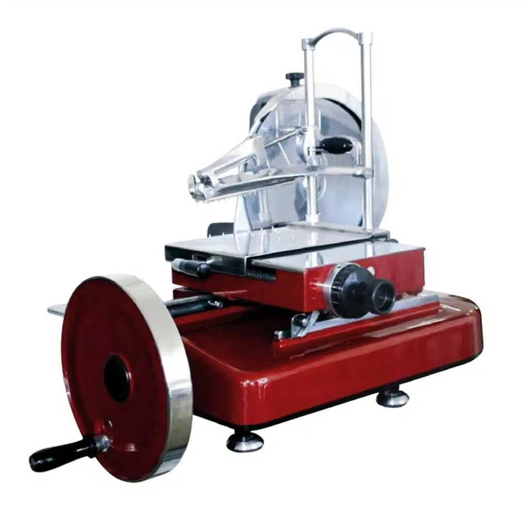 Trancheur manuel traditionnel modèle vol 250, parfait pour la présentation en salle et la découpe pour dégustation, spécialement conçu pour les professionnels de la boucherie.