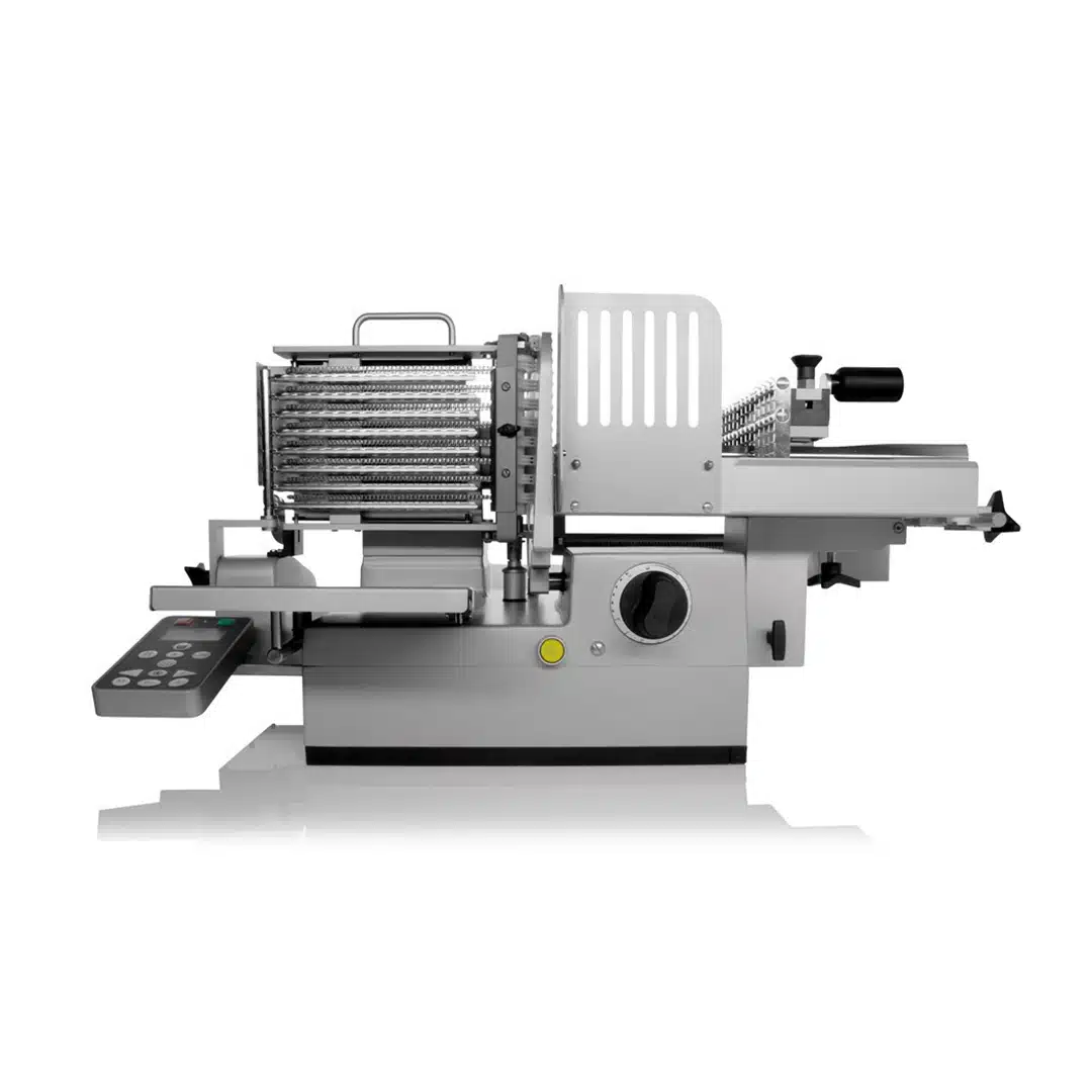 Trancheuse automatique avec dépose sur plateau modèle VA 804, programmable, précis, fiable pour usage intensif.