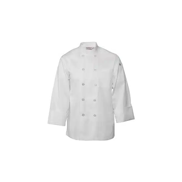 Veste chef unisexe blanche, idéale pour tous les environnements CHR, des restaurants étoilés aux cuisines d’hôtel.