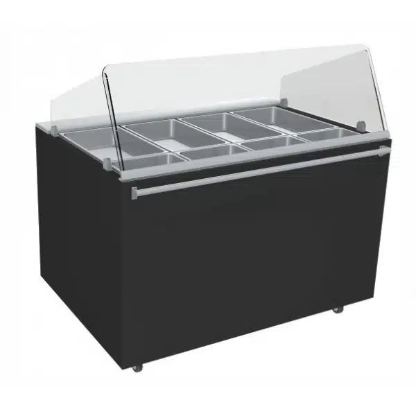 Cette vitrine peut être utilisée avec un lit de glace dans la cuve en présentation froide (salades)